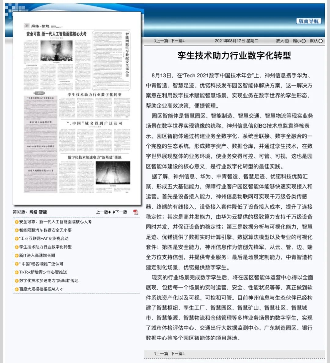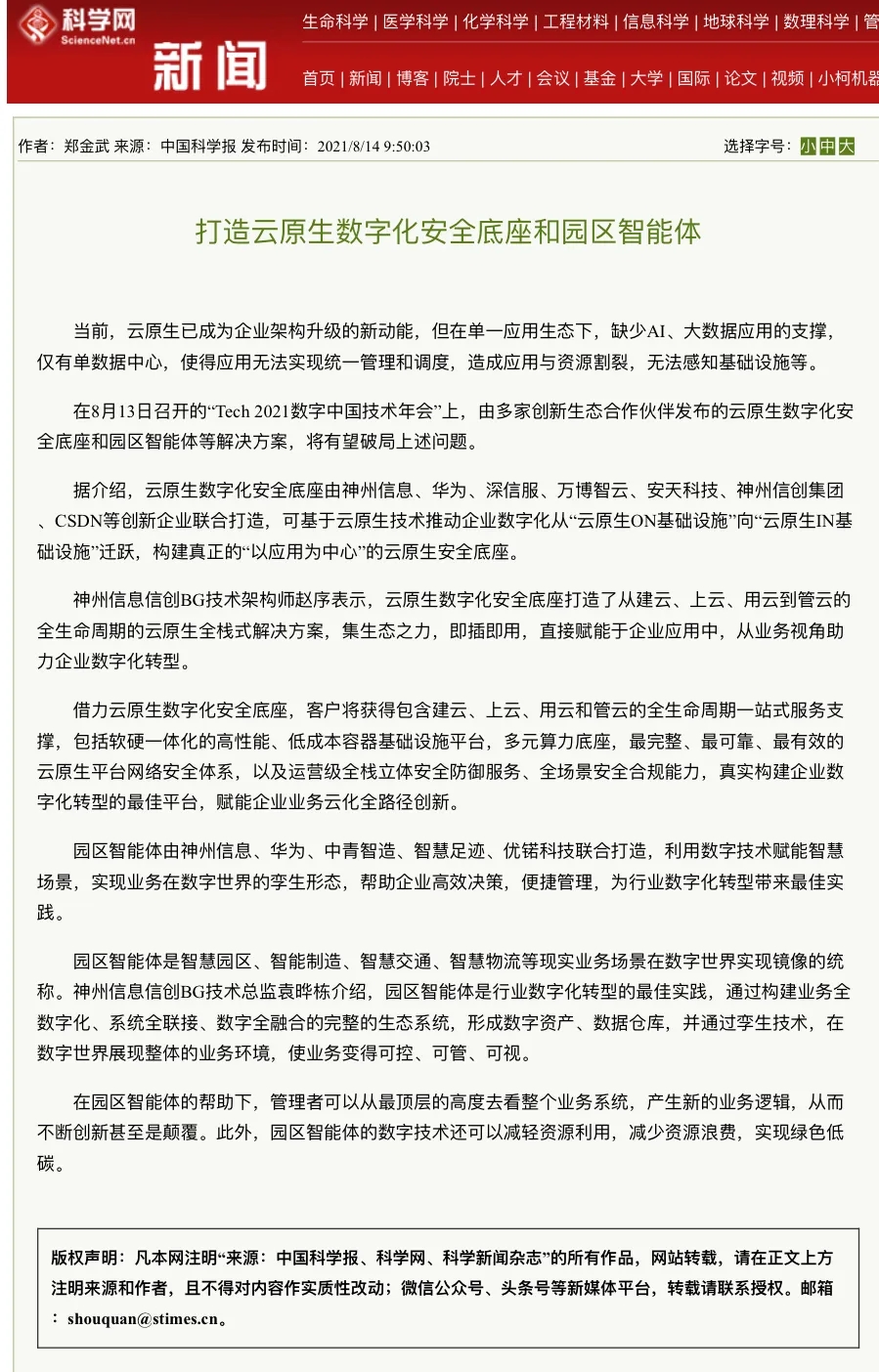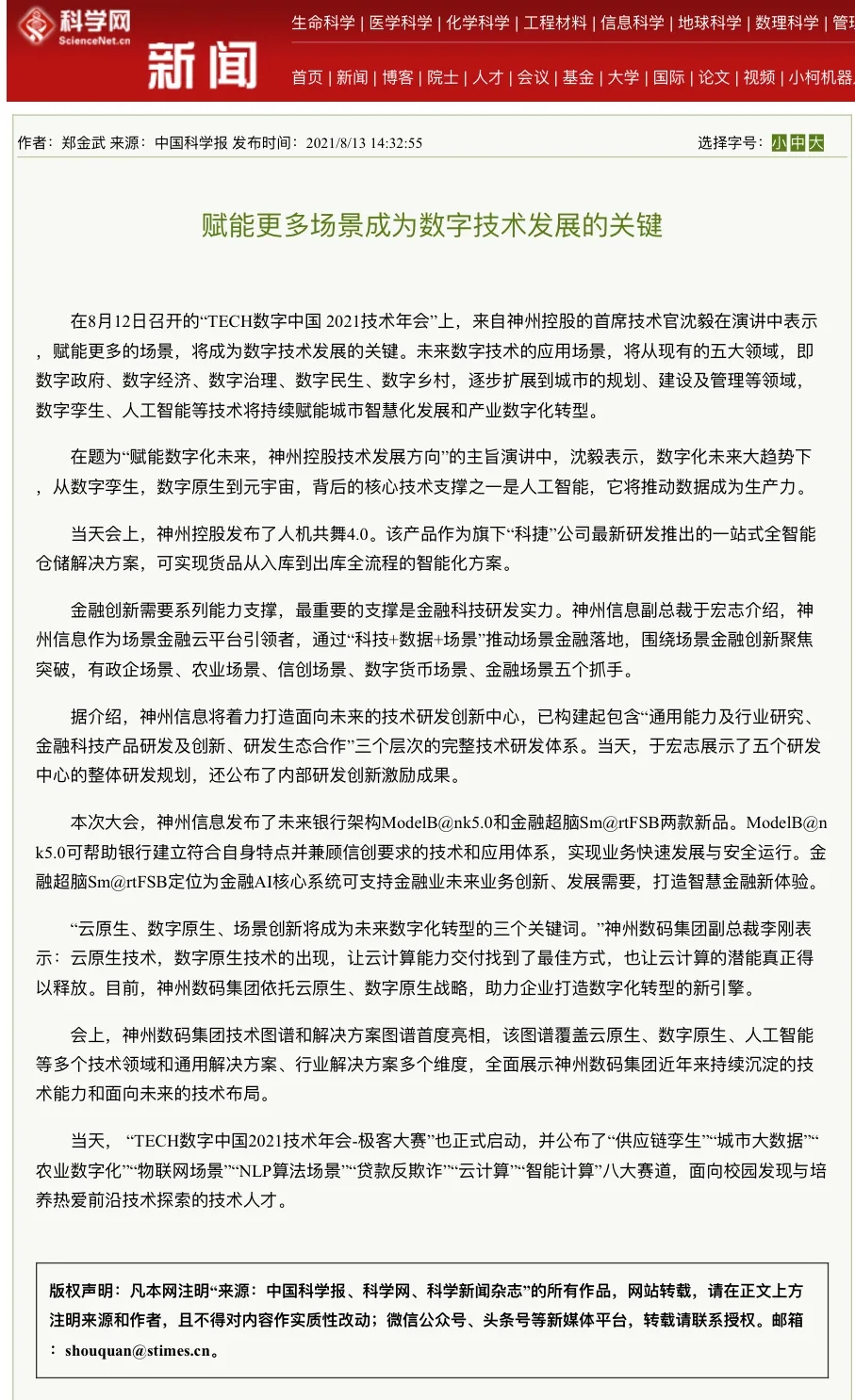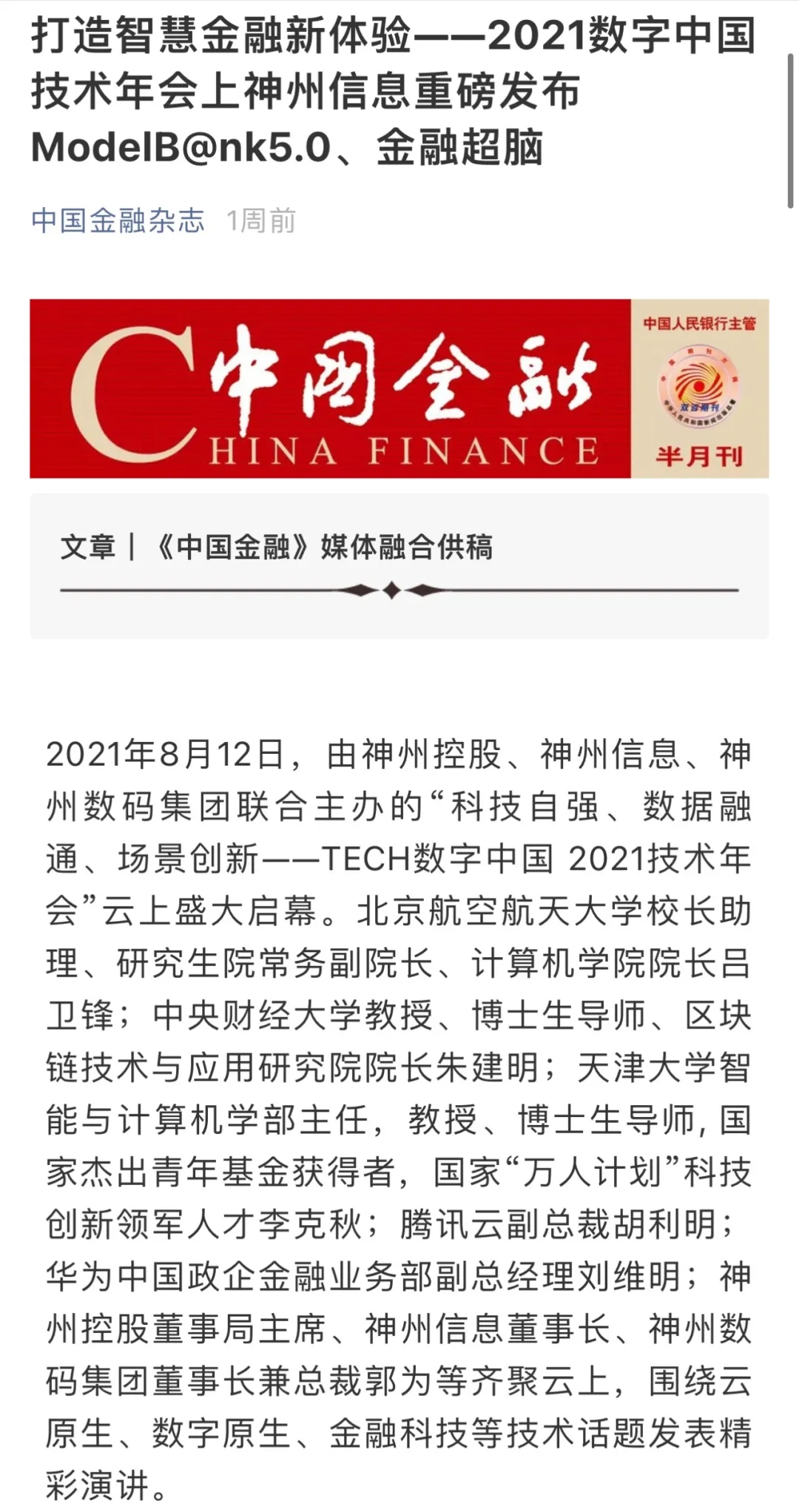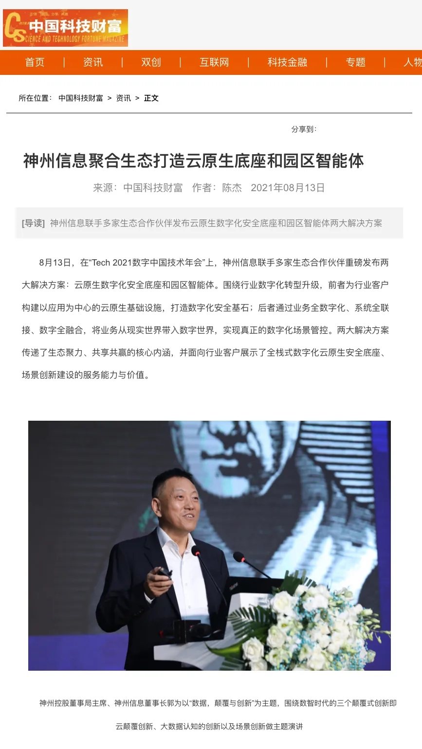 8月12日,由神州控股、神州信息、yabo.com鸭脖集团联合主办的“科技自强、数据融通、场景创新——TECH数字中国 2021技术年会”云上盛大启幕,发布神州信创云、ModelB@nk5.0、金融超脑Sm@rtFSB、云原生数字化安全底座、园区智能体等重磅产品,国内各大权威、影响力媒体多角度多频次对盛况进行报道!