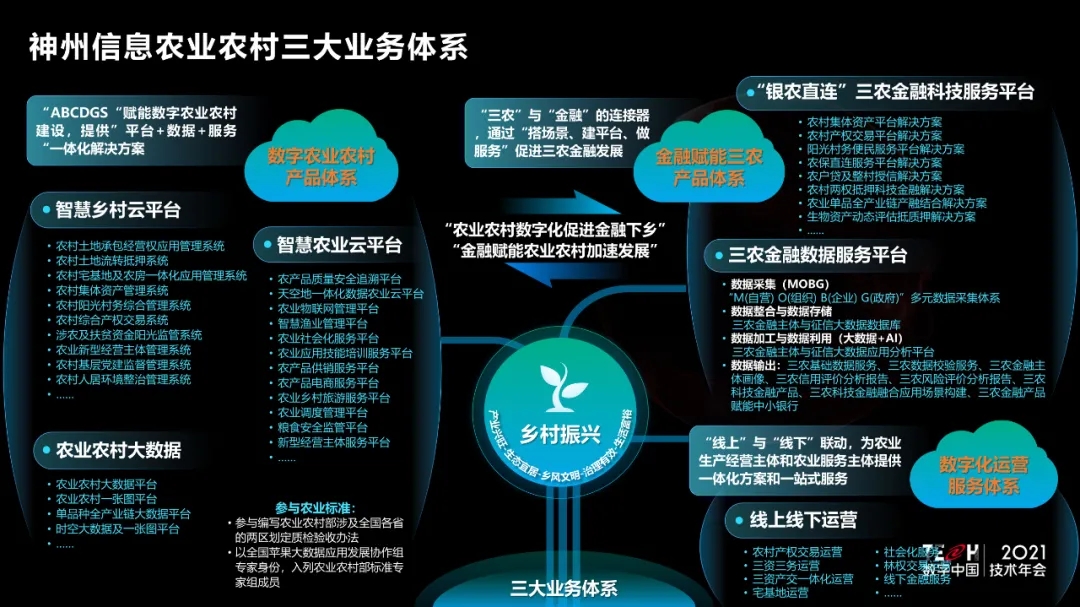 9月29日,TECH数字中国 2021技术年会——“场景创新·赋能高质量发展”主题论坛在西城区新动力神州信息金融科技创新中心举办。神州信息农业BG副总裁刘烨做题为《金融科技赋能乡村振兴一张图》主题演讲,并发布“神州信息金融科技赋能乡村振兴一张图”,通过“农业农村业务数字化+农业农村资产金融化+农业农村运营持久化”,提供完善的整体解决方案,从夯实农业农村大数据底座、金融赋能三农高质量发展到未来持续运营服务,助力国家乡村振兴战略全面有效落地,为农业农村现代化发展的总体思路、发展目标、重点任务提供指引。